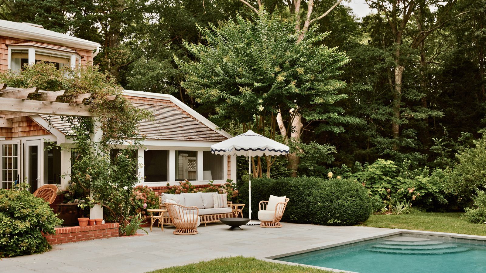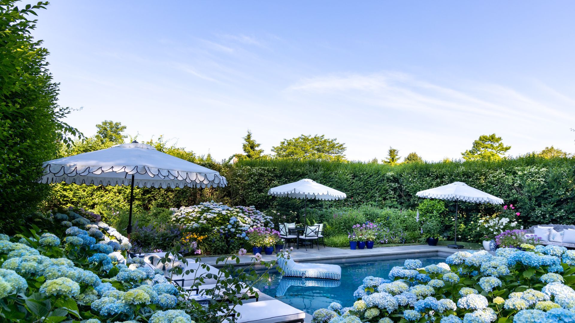 ‚Außerdem das Meeres Meer, die den Schwimmbadbereich und den Umfang des Hauses auskleiden, das fundamental Hamptons ist. Die Veranda des Hauses ist eine Fülle von blauen Hortensien. In der Ferne befindet sich der Poolbereich, der durch eine üppige blaue Hortensie -Hecke teilweise nicht zu sehen ist. ‚