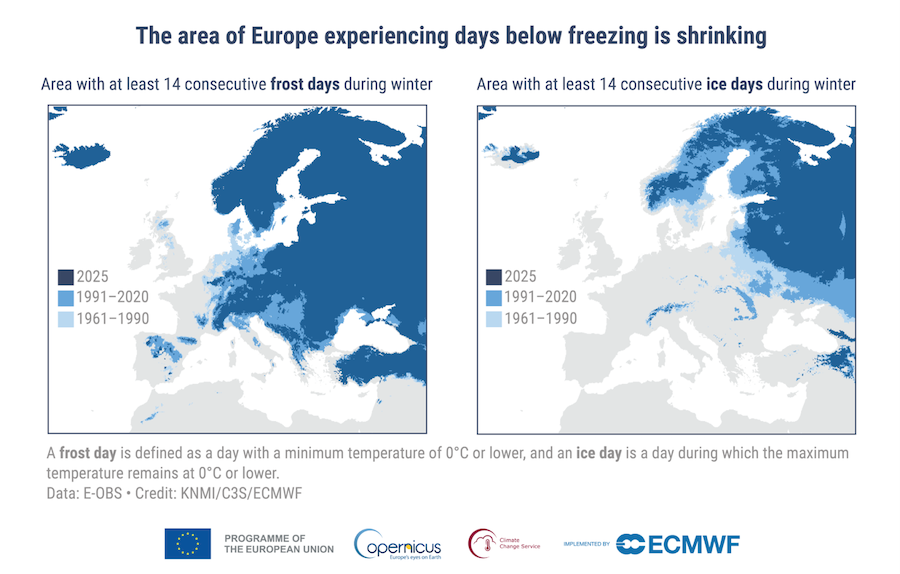 Mindestens 95 % Europas verzeichneten im Jahr 2025 überdurchschnittliche Jahrestemperaturen, während der Anteil Europas, in dem es Wintertage mit Minustemperaturen gibt, schrumpft. Das subarktische Fennoskandinavien erlebte im Juli mit einer Dauer von drei Wochen die längste Hitzewelle seit Beginn der Aufzeichnungen. Während dieser Zeit erreichten und überstiegen die Temperaturen in der Nähe und innerhalb des Polarkreises 30 °C und erreichten mit 34,9 °C ihren Höhepunkt in Frosta, Norwegen. Unterdessen verzeichnete Europa insgesamt eine rekordverdächtige Anzahl an Kältestresstagen, wobei 90 % des Kontinents weniger Tage als der Durchschnitt mit mindestens „starkem“ Kältestress erlebten. Die Tiefsttemperaturen blieben fast das ganze Jahr über über dem Durchschnitt.